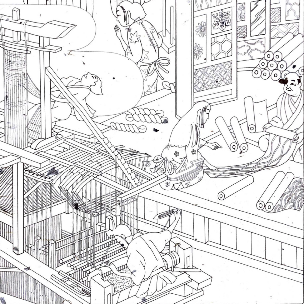 西陣織を一言でいうと、色糸を使って紋を織り上げる先染紋織物です。品種や紋様により工程は少しずつ異なりますが、和デニムで採用した紋様が出来上がる工程の一部をご紹介します。
